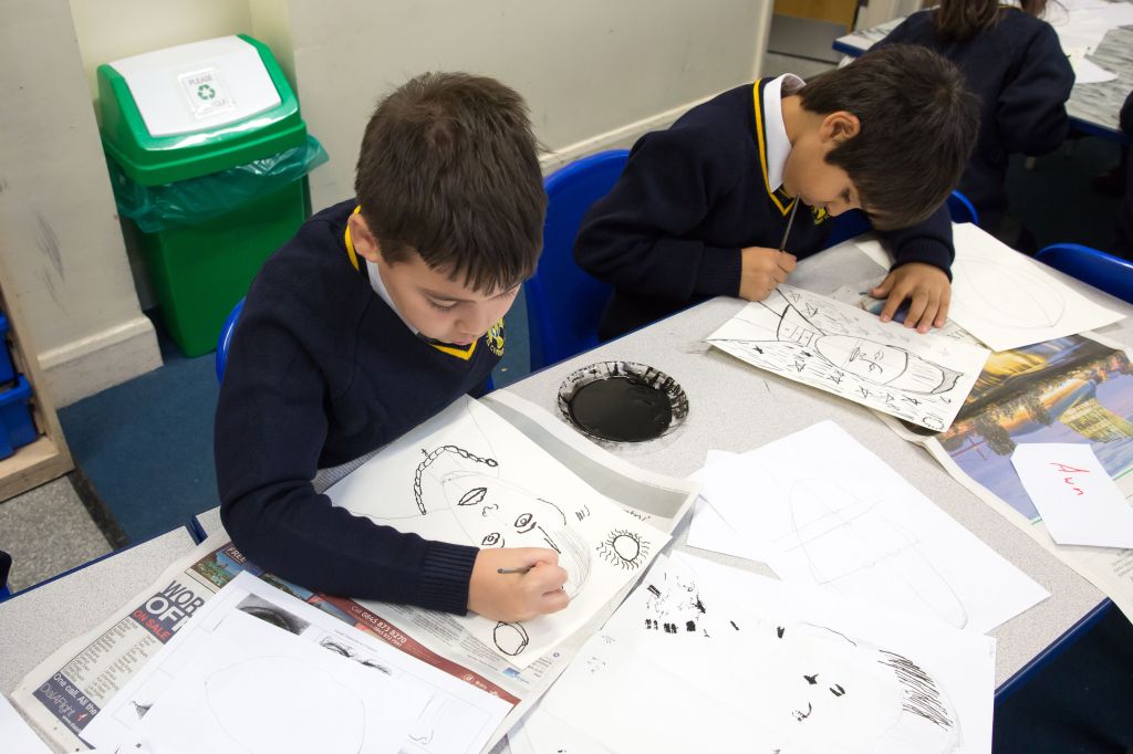 Children working on self-portraits as part of a Storytelling Plus project